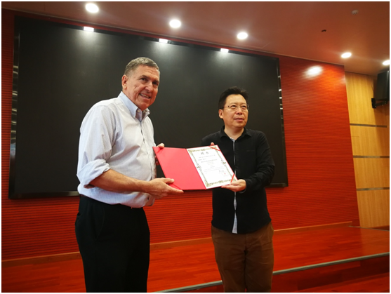 大数据与互联网学院院长相韶华教授为凯尔·司徒凌教授颁发聘书,聘任为我校客座教授,促进双方未来友好合作不断向前发展。