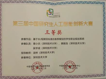 我校参赛队伍在这次比赛中以社会实际的热点需求出发,着眼于高考教育改革新方向,并以学生群体为主,包括所有对长远职业规划建议有所需求的社会群体,设计了一个基于长/短期目标混合推荐模型的职业规划系统。具体以对话系统的方式实现用户和系统的实时交流反馈,结合多峰输出的深度学习推荐模型,给予用户长期的职业规划建议,和短期需要实现的学习目标建议。历史数个月的项目调研和论文撰写工作,队员们的团队协作和指导教师的耐心教导使得整个项目工作圆满完成,荣获了国家三等奖的成绩!