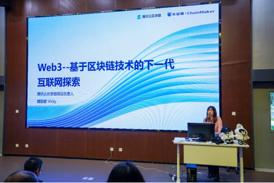 腾讯长安链负责人魏聪颖介绍了Web3--基于区块链技术的下一代互联网探索。她希望依托此次校源行活动,分享长安链开源社区“开源开放、共建共享”的理念,链接更多高校开发者和区块链爱好者,共同建设活跃开放、良性互动的开源社区生态。