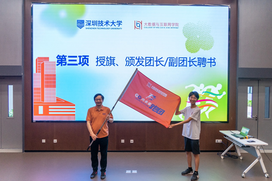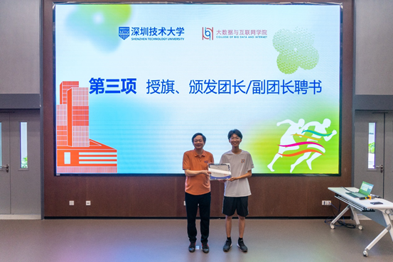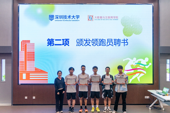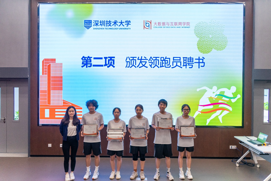 为了做好跑团工作,学院专门设计了“青春向未来”跑团旗帜,选聘了团长、副团长,通过自愿报名选拔了第一批领跑员,以此带动更多同学参加跑团,同时做好日常考勤和数据统计。叶建华书记颁发团长、副团长聘书,向跑团授旗;陈泉凤、邱雅晴老师颁发领跑员聘书。