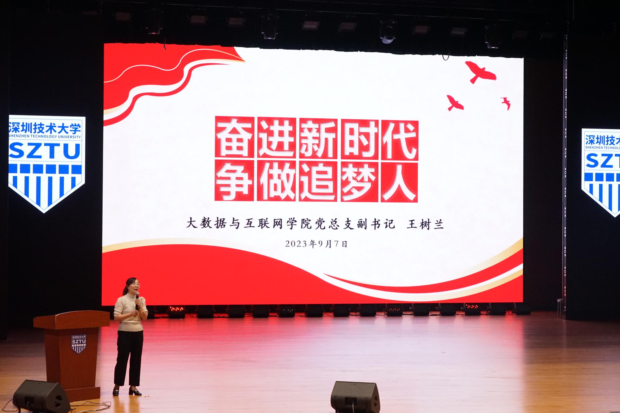 王树兰老师以“奋进新时代 争做追梦人”为主题,结合多年学生工作经验进行分享。她从新生如何适应大学学习生活、转换角色等角度出发,希望同学们要适应环境,尽快缩短适应期,完成心理、生活和学习上的转变;关注前沿科学知识学习,确立适合自己的生涯发展目标、行动计划,学会做事、学会交往、学会做人,开辟人生的新阶段和新境界。同时,围绕学院特色与实践,鼓励同学们积极加入学院联合国内企业和海外名校开创的产业学院与特色班,如华为未来技术学院、腾讯安全特色班、伦琴AI班、大华物联网智慧班等,基于自身兴趣参加无人机协会、RoboMaster 悍匠战队、ACM算法与程序设计创新实验室等竞赛俱乐部,参与到丰富多彩的大学生活中,激发竞赛意识,培养创新思维和实践能力,尽快融入深技大大家庭中。