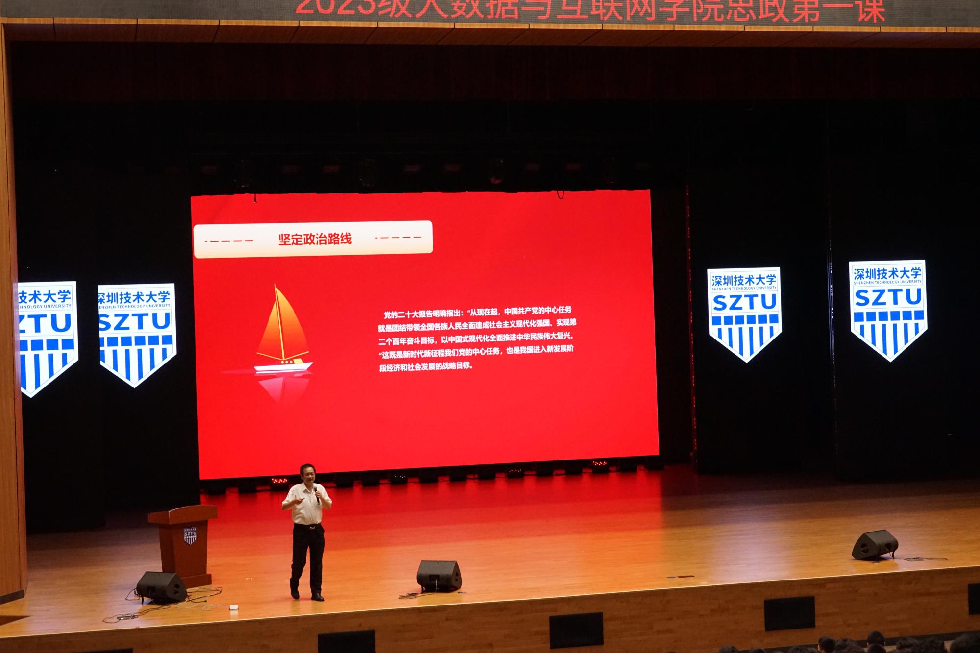 叶建华老师代表学院向加入大数据与互联网学院的2023级的新生们表示热烈欢迎。叶老师指出,思政第一课作为全体新生的第一堂课,是大学学习生活的新起点,“当代中国青年生逢其时,施展才干的舞台无比广阔,实现梦想的前景无比光明”,寄语同学们要坚持以党的二十大精神为指引,牢固树立正确的人生观,不要把思政教育和专业学习分割开来;紧密围绕广东省第十四个五年规划和2035年远景目标纲要,把握深圳建设中国特色社会主义先行示范区的时代机遇,积极投身粤港澳大湾区建设,把“国家所需、个人所长”结合起来,以实际行动为实现中华民族伟大复兴的中国梦贡献青春力量。