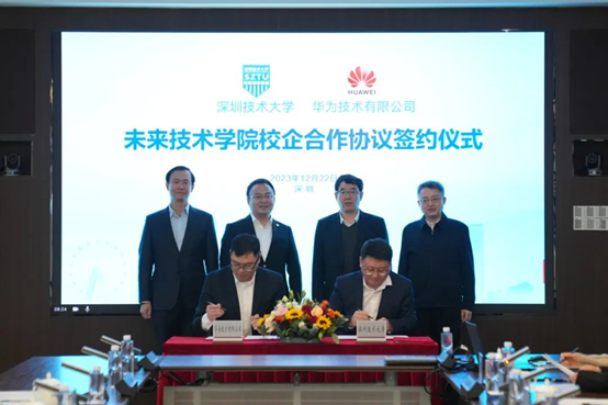 作者: 大数据与互联网学院 日期: 2023/12/2612月22日,深圳技术大学与华为技术有限公司签署未来技术学院校企合作协议,举行鲲鹏&昇腾产教融合育人基地授牌仪式,落地广东首个“鲲鹏菁英班”。双方将充分发挥各自优势,共同构建高效校企合作运行体系,在师资建设、创新课程、人才培养、智慧校园等方面展开合作。深圳技术大学校长阮双琛、副校长梁永生和华为公司高级副总裁、企业BG伙伴发展部部长肖海军、华为公司深圳政企业务部总经理盛凯出席仪式。
