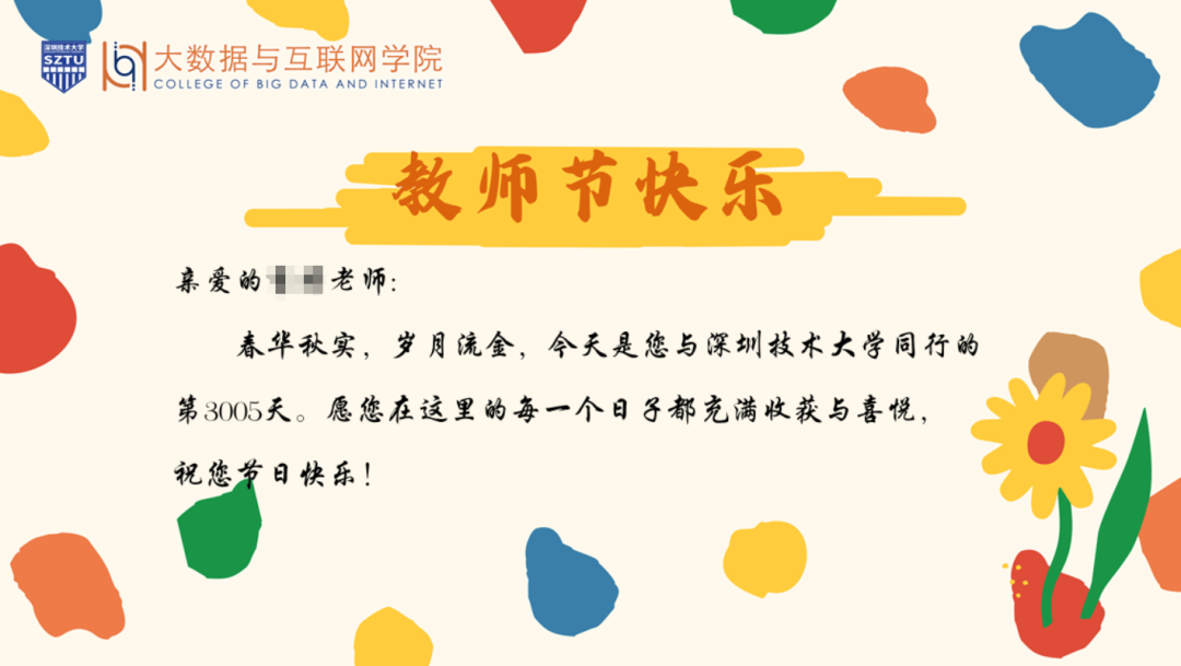 学院通过电子邮箱的形式,为每一位教师送上一份定制电子贺卡。我院教师通过编写程序,实现每张贺卡都由程序生成并自动将贺卡发送给所属的老师,记录着每一位老师与学院一路同行的时光,为老师们送去别样的节日惊喜与真挚心意。