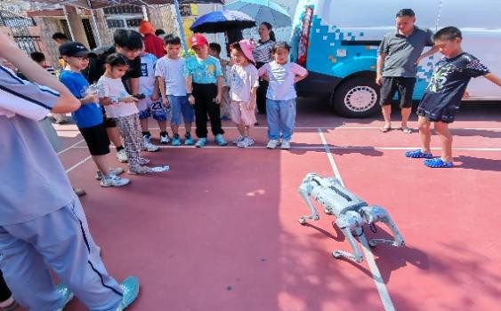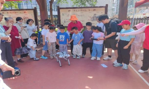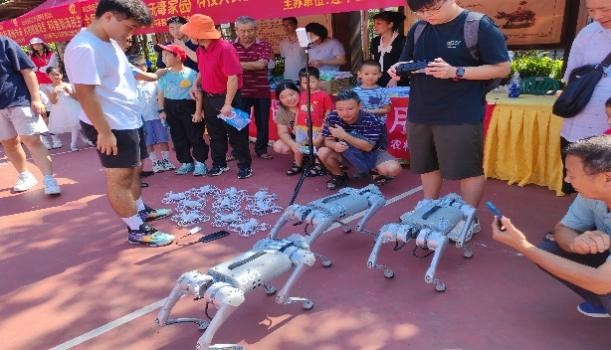 活动现场,我院李菊、苏妍双两名带队老师带领同学们进行了机器狗和无人机操作演示,无人机在空中灵活翻转,划出优美的轨迹,机器狗则展示了精准的行走、跳跃和互动能力,引得现场阵阵欢呼。更值得关注的是,活动特别设置了 “亲手体验”和讲解环节,同学们生动讲解其技术原理与实际应用,并邀请观众亲手操作体验,近距离感受人工智能与先进装备带来的科技魅力,进一步激发了对科学技术的探索兴趣。