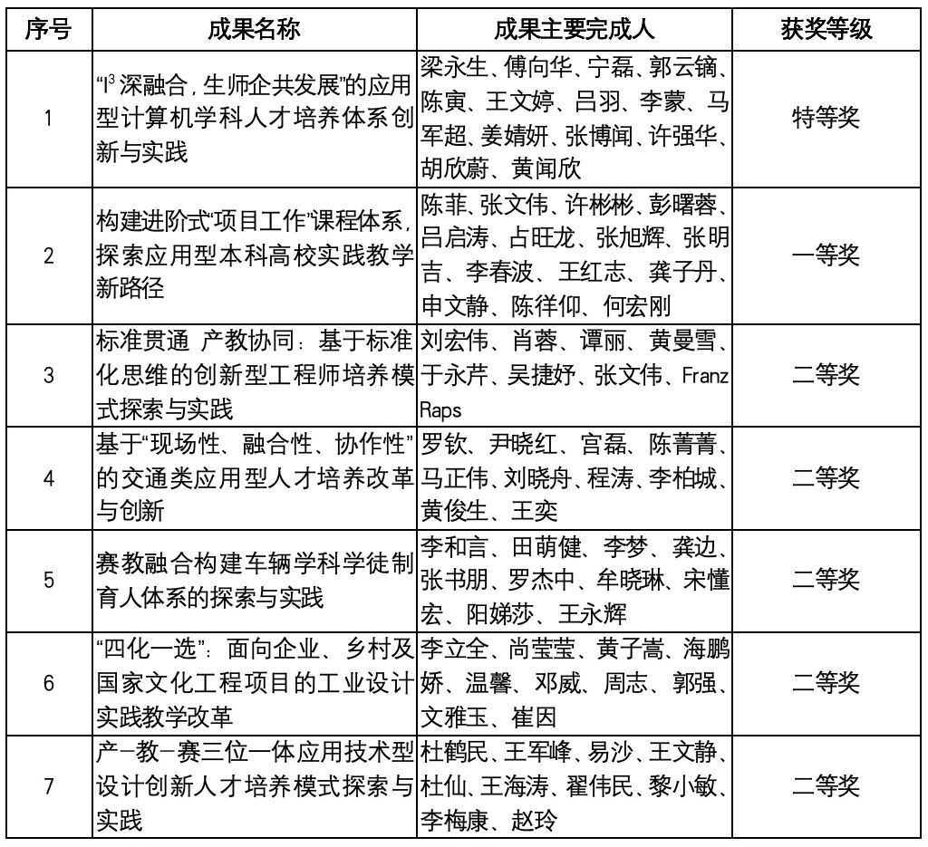 由梁永生副校长领衔的《“I³深融合,生师企共发展”的应用型计算机学科人才培养体系创新与实践》荣获特等奖。该成果以“I³深融合,生师企共发展”为核心育人理念,通过夯实国际化底座、深化产教融合、强化科教融汇、AI赋能和推动以文化人五项举措,持续提升应用型育人环境,释放教育链、创新链、人才链和产业链融合效能,并基于生师企成长共同体,以国际化、产业和创新作为评价应用型育人环境质量的三大核心维度,提出数据驱动、可量化和可迭代的人才培养体系评价方法。成果在培养理念的顶层牵引、培养路径的系统构建和评价方法的闭环迭代方面进行创新突破,通过“全链条设计-全过程实施-全流程评价”闭环机制,有效提升应用型计算机学科育人环境,促进生师企协同发展,为全国应用型高校培养卓越工程师提供了示范引领和可复制范式。