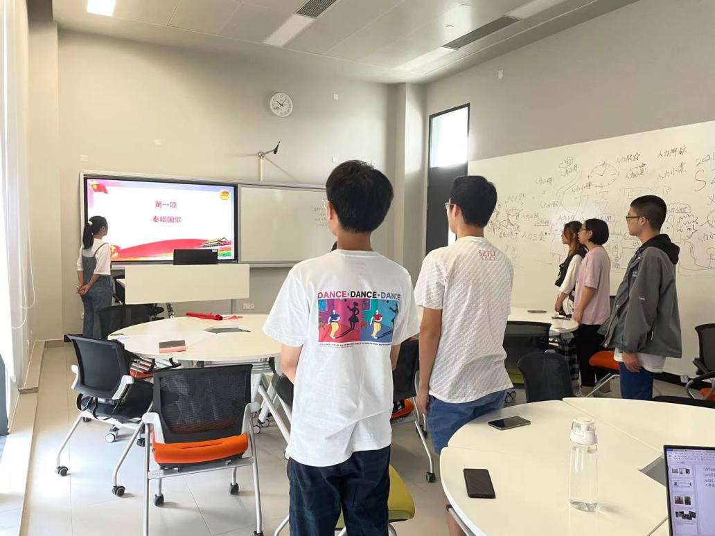 首先,全体同学共同奏唱国歌,声音洪亮,气势澎湃,我们为生于华夏而心存感激,为生为中国人而自豪。