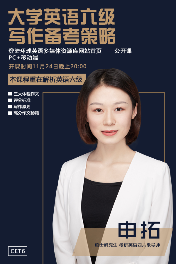 环球英语联合图书馆将举办以大学英语六级写作备考策略为主题的线上讲座,欢迎各位同学积极参加!