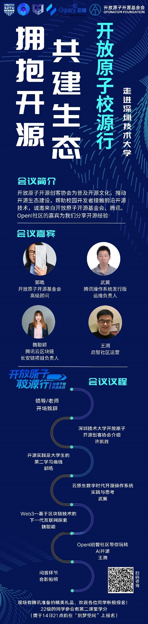 本次讲座主题为开源实践的前沿和当今时代下开源实践的机遇和挑战。本次报告邀请了领域专家一起分享开源实践的观点和经验,云原生下开源操作系统的变革,区块链技术领域的前沿技术和应用,以及启智AI开源社区的关键技术和发展思路。本次讲座旨在推广开源文化,传播开源理念,提高我校学生对开源领域的认知。