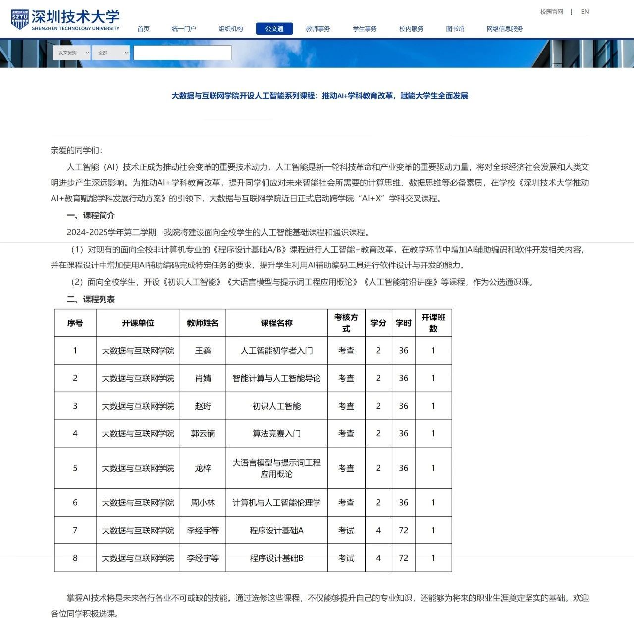 3月8日,深圳技术大学举行人工智能微专业启动仪式。作为学校落实国家《新一代人工智能发展规划》和广东省教育厅《广东省本科高校人工智能人才培养实施方案》的重要举措,该微专业通过“线上+线下”融合、理论与实践结合的教学模式,通过项目驱动学习(Project-based Learning)和案例教学,提供真实的AI应用场景,为全校非计算机专业学生提供系统化人工智能教育,培养适应未来产业需求的“AI+X”复合型人才。教务部主任刘宏伟致...